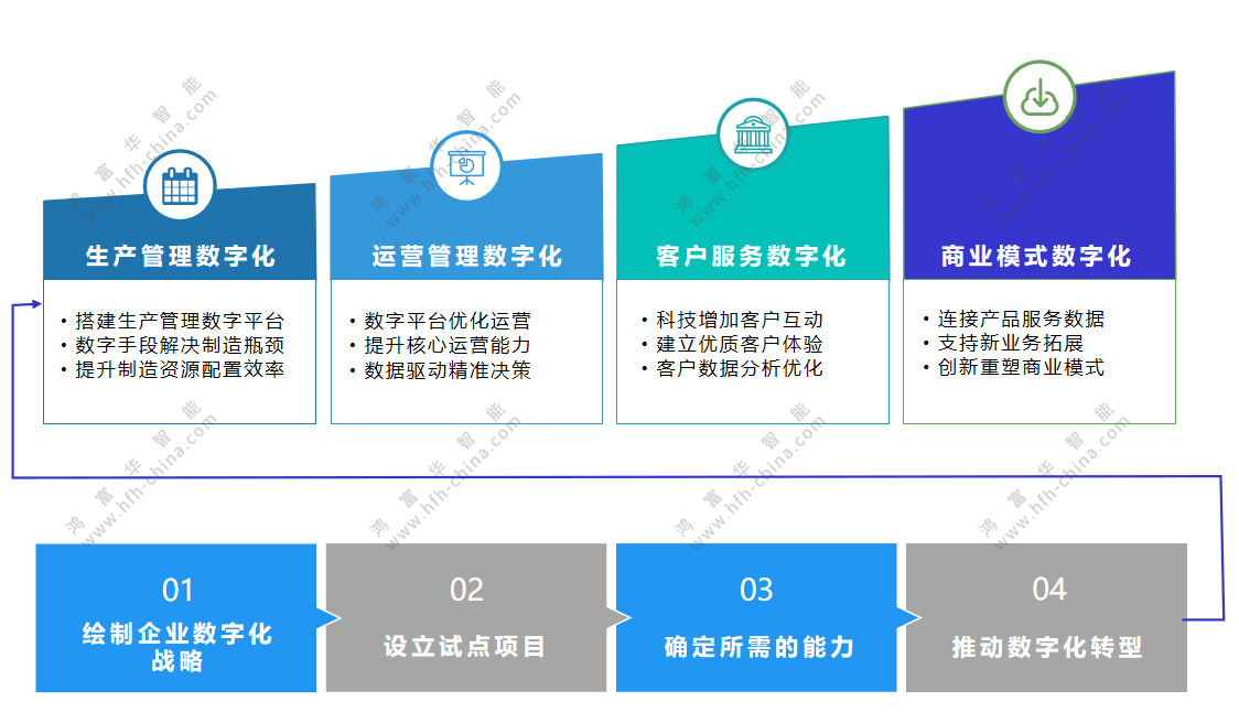 數字化轉型常被形容為“一把手工程”,必須從領導層開始形成從上至下的重視,驅動企業文化的變革。同時,企業需要重新梳理流程和管理,這也是企業中面臨最大的挑戰。運用數字化技術可以加快流程和管理的變革,促進業務的創新。鴻富華為客戶提供企業數字化規劃咨詢(包括數字化戰略頂層設計和實施規劃)、業務與制造流程合理化、關鍵管理系統的開發與實施服務,幫助企業更合理、穩妥的推動數字化升級轉型。