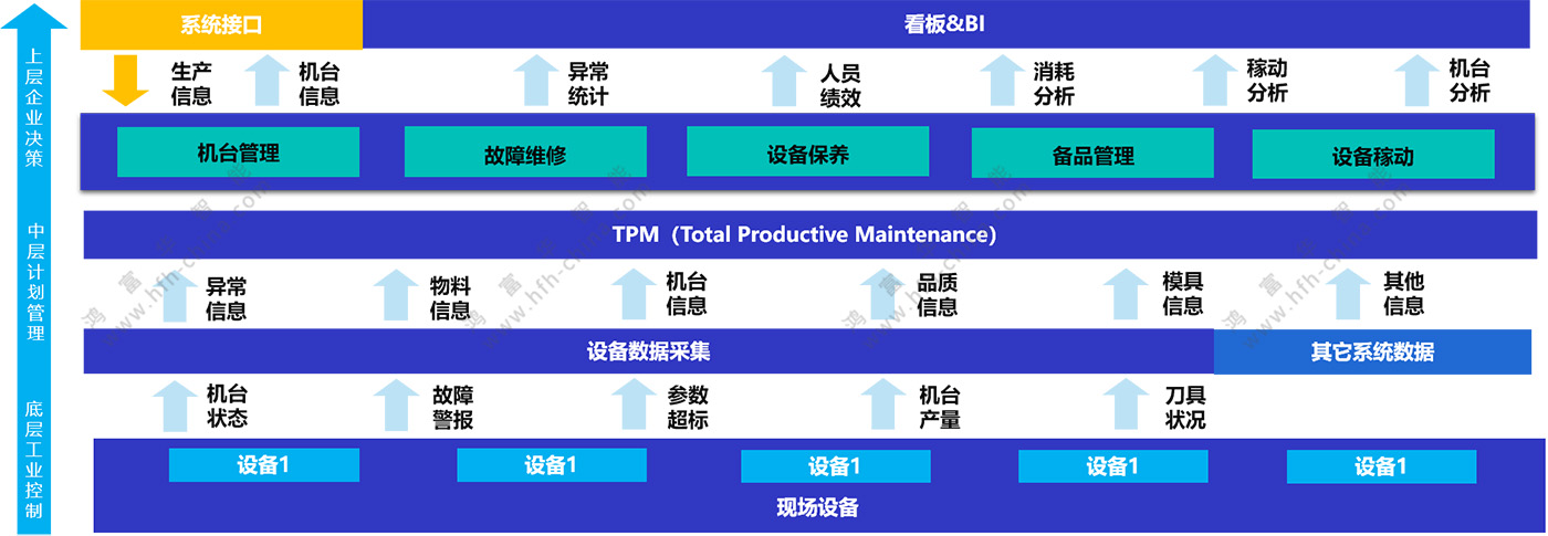 在中層“生產管理上”,根據不同維度(機臺信息、生產信息、物料信息、質量信息、模具信息)為TPM對應的機臺管理、故障維修、預防保養、備品管理及設備稼動提供依據。