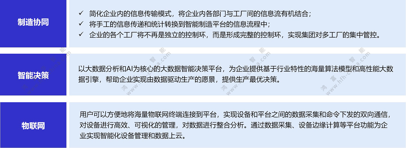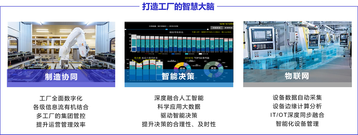 智能制造運營管理平臺,主要包含制造協同、智能決策、物聯網三個子平臺。需要實現計劃協同、生產協同、品質協同、庫存協同及生產透明化、物流一體化、管理移動化、決策數據化。信息化建設的主要模塊:制造計劃整體排產、供應鏈需求整體拉動、廠內物流智能拉動、MES與自動化對接、QMS品質分析平臺建設、訂單跟蹤全流程透明、移動APP建設等。